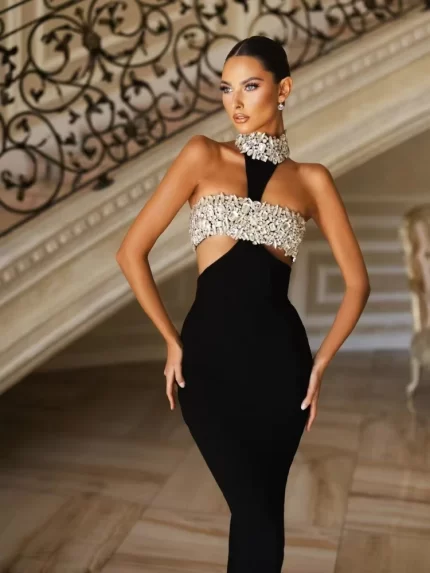 Women Celebrity Sexy Halter Beading Crystal Black Maxi Long Bodycon Bandage Dress 2025 Elegant Evening Club Party Dress
