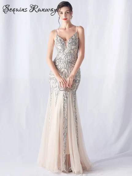 Women Luxury Sexy V Neck Feather Beading Mesh Sequins Sparkly Maxi Long Gowns Dress Elegant Celebrity Evening Party Club Dress
