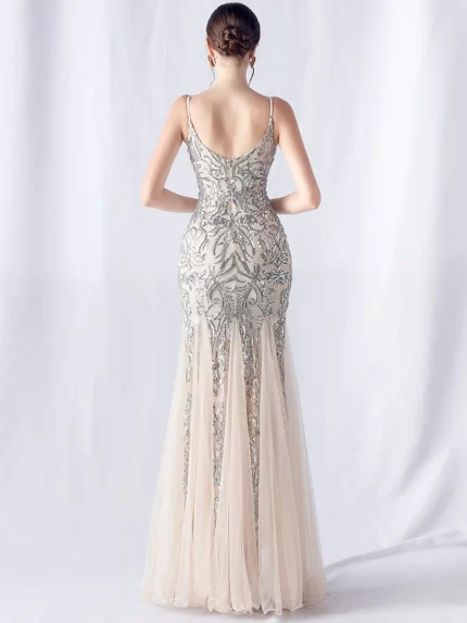 Elegant V-neck Hollow Out Slim Fishtail Dress 2026 Casual Sleeveless Solid Evening Dress Women Fashion Split Sequin Long Dress