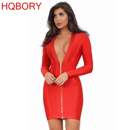 HQBORY Deep V Plunge Red Bandage Women Dress Evening Maxi Long Sleeves Black Zipper Supper Mini Dress Bodycon Party Club Vestido