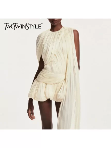 TWOTWINSTYLE Solid Spliced Mesh Mini Dresses For Women O Neck Sleeveless High Waist Temperament Mini Dress Female Fashion New