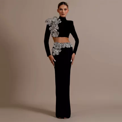 Black Color Women Long Sleeve Sexy Diamond Flowers 2 Pieces Bodycon Long Bandage Dress Celebrate Nightclub Party Outfit Vestido