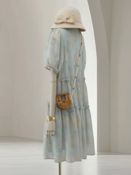 Women’s V Neck Short Sleeve Lace Embroidered Midi Dress French Elegant Tiered Summer Dress with Hollow Out Floral Details
