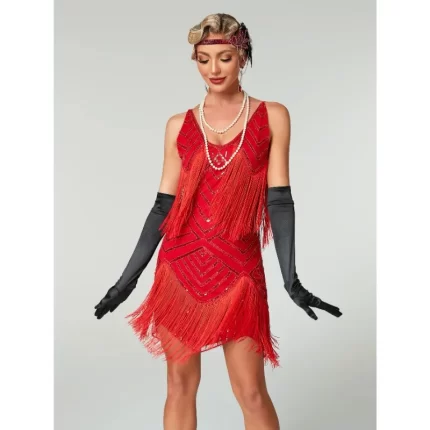 1PC 1920s Vintage Sequin Panel Tassel Hemline Elegant Big V- Neck Evening Dress For Women