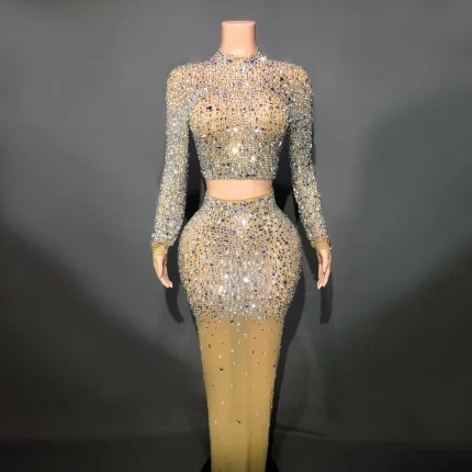 Sparkly Rhinestones Top Long Skirt Sexy Transparent Stretchy Two Pieces Set Celebrate Evening Prom Gown Birthday Dress for Women