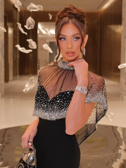 Elegant Black Evening Gown with Sheer Beaded Cape High-Neck Formal Maxi Dress for Women Rhinestone – Embellished Party Dresses