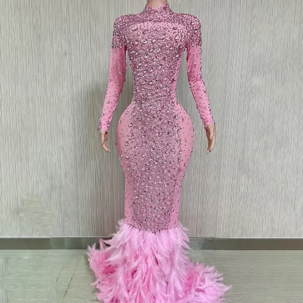 Luxury Shiny Crystal Diamond Elastic Tight Feather Splice Dress Empress Cross dress Show Luxury Prom Dress Performance Costume