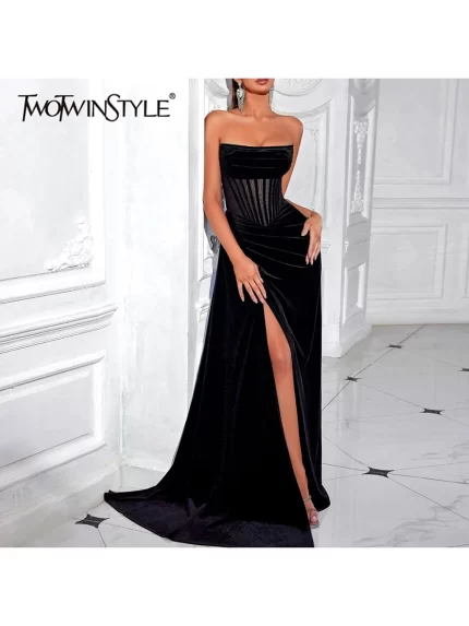 TWOTWINSTYLE Solid Slimming Split Dresses For Women Strapless Sleeveless High Waist Temperament Long Dress Female Fashion Style