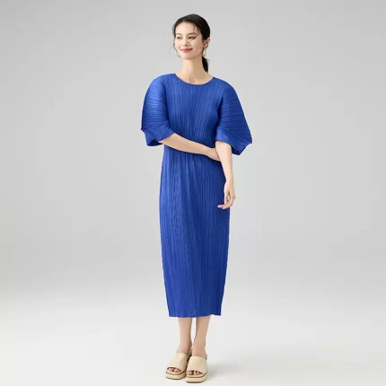 Miyake Pleated Solid Color Dress 2025 Summer New Premium Feeling Round Neck Loose Fashion Comfortable Casual Long Dresses