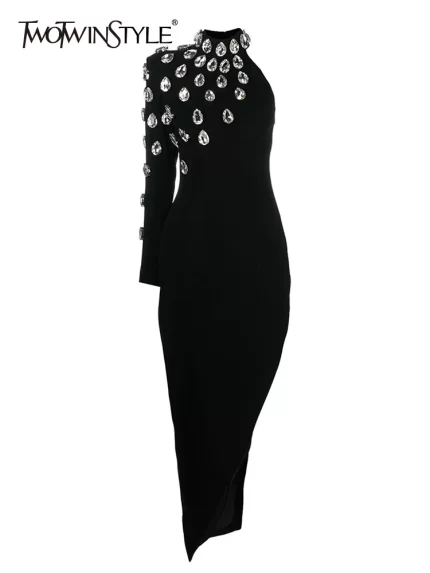 TWOTWINSTYLE Patchwork Diamonds Designer Dresses For Women Stand Collar long sleeve Temperament slimming Dress Female Fashion