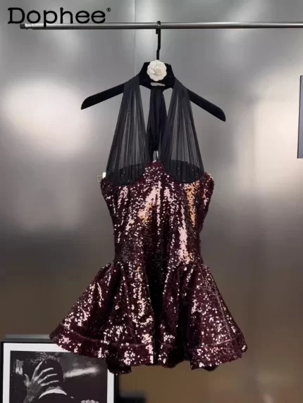 Spring and Summer 2025 New French Retro Heavy Industry Sequined Yarn Neck Slim Backless Dress Sexy Dress for Women
