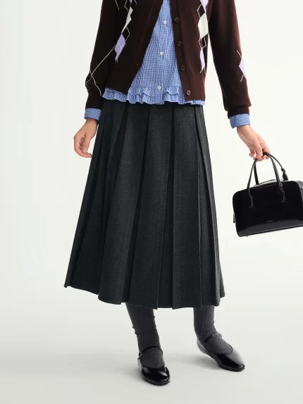 DUSHU Long Pleated Skirt Women Gray Solid Simple Basics 2025 Autumn and Winter High Waist A-line Mini Skirt Korean Style