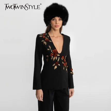 TWOTWINSTYLE Solid Slimming Spliced Beading Elegant Blazers for Women U Neck Long Sleeve Tunic Patchwork 3D Flower Blazer Female