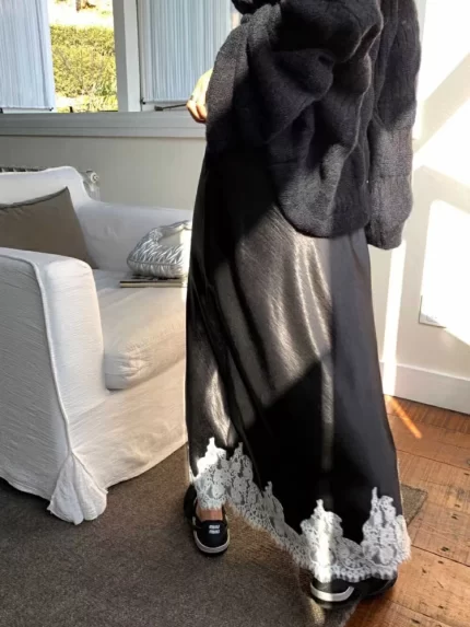 Satin Lace Patchwork Midi Skirt 2025 Women A-line Elegant Smooth Skirt Women Clothing