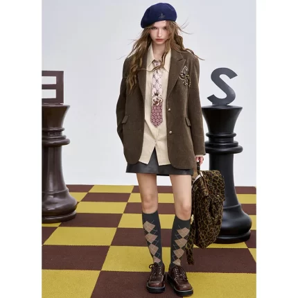 Elegant khaki spliced brown long sleeved lapel single breasted jacket autumn new clothing silk wool blend women’s jacket