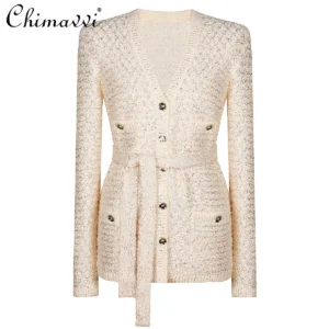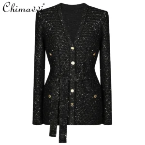 2025 Spring and Autumn New High-end Fashion Long-sleeved Sequined Knitted Cardigan Elegant Commuter V-neck Cardigan Top Jacket