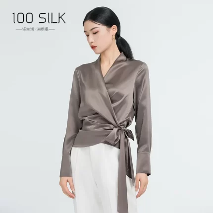 Elegant Mulberry Silk Long Sleeve Blouse Office Commute Shirt with Waist-Defining Tie Sophisticated Workwear Casual Chic Top