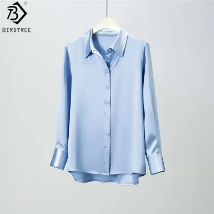 Birdtree, 30MM 100% Real Silk Solid Blouse, Women’s Satin Elegant Lapel Shirt, Full Sleeve Tops, 2026 Spring Summer New T61825JF