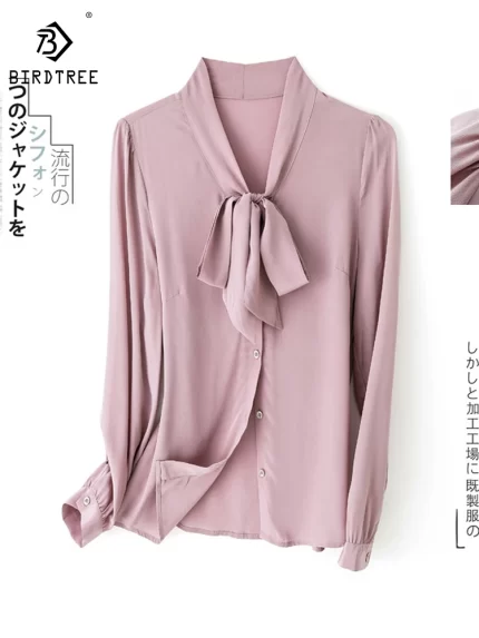 Birdtree 100% Real Silk Women’s Blouse Office Lady Work Bow Long Sleeve Elegant Shirts 2023 Spring Summer Solid Tops T37754QC