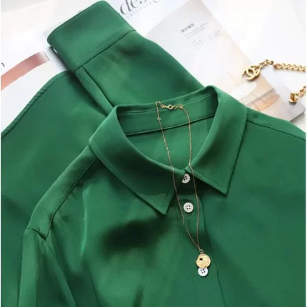 Women’s French Style High Quality 40 MM Heavy Office Lady Solid Satin Silk Long Sleeve Shirt Ladies’ Blouse