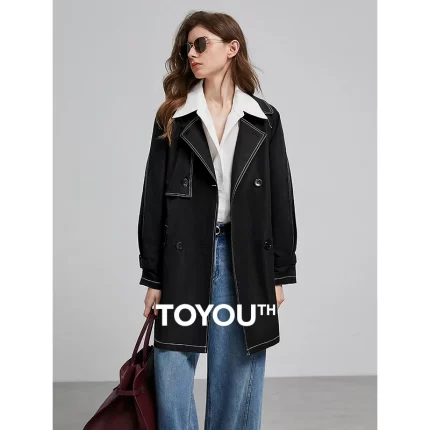 TOYOUTH Women Windbreaker 2025 Spring New Contrasting Color Lapel Collar Medium Long Workwear Jacket With Waistbelt