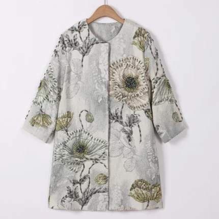 DLDENGHAN Autumn Covered Button Beading Coat Women O-Neck Three Quarter Sleeves Flower Print Vintage Outerwear Fashion Designer
