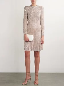 2025 Women Celebrity Sexy Long Sleeve O Neck Beading Apricot Midi Bodycon Dress Elegant Evening Party Club Outfit Vestido