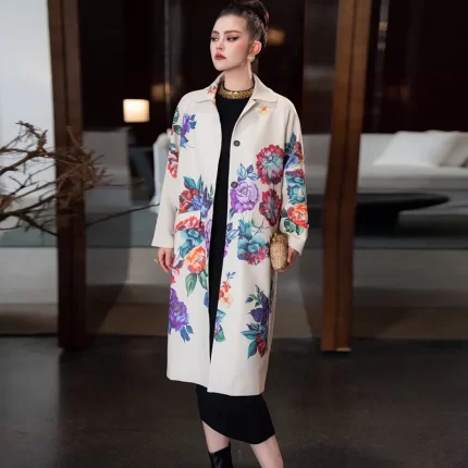 Seifrmann Solid Long Sleeve Turn-Down Collar Coat For Women Single-Breasted Floral-Print Loose Waist Fashion Overcoat