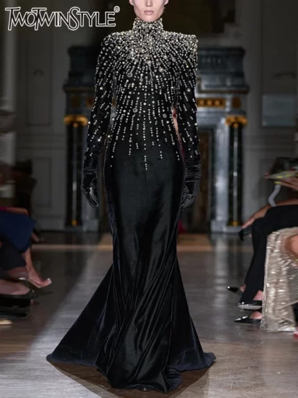 TWOTWINSTYLE Solid Slimming Fashion Midi Dresses for Women High Neck Long Sleeves Patchwork Diamonds Elegant Dress Female New