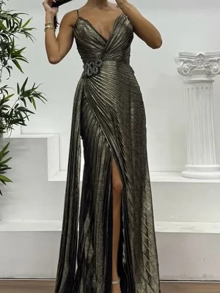Women Fashion Hight Waist Pleated Banquet Dress Sexy Backless Solid Slim Long Dress Elegant V-neck Sleeveless Split Party Dress