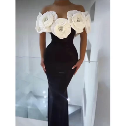 Stereoscopic White Flowers Sexy Off The Shoulder Ankle Lenght Bandage Dress Woman Birthday Party Vestido Wedding Party Outfit