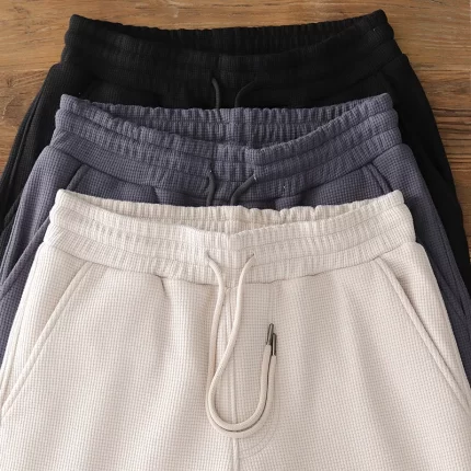 Winter Japanese Retro Heavyweight Thick Velvet Waffle Knitted Sweatpants Men’s Casual Sport Elastic Waist Drawstring Loose Pants