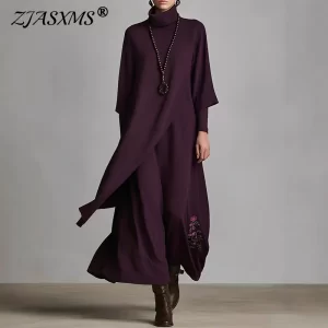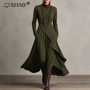 2026 Spring Elegant Turtleneck Irregular Long Dress Woman Solid High Waist Pocket Party Dress Autumn Long Sleeve Slim Maxi Dress
