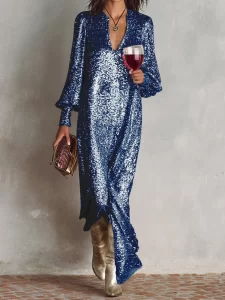 2026 Sexy V Neck Sequined Maxi Dress Women Spring Autumn Loungewear Party Dress Long Sleeve Solid Patchwork Ladies Chic Dresses