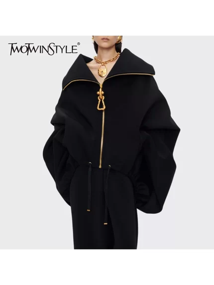 TWOTWINSTYLE Solid Loose Spliced Zipper Fashion Jackets for Women Lapel Long Sleeves Patchwork Lace Up Casual Jacket Female New