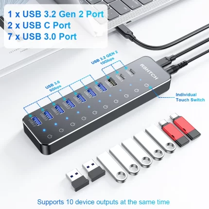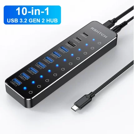 RSHTECH USB C Hub 10Gbps Laptop USB Hub Individual Touch Switches 10-IN-1 Aluminum Multiport Adapter for Macbook Accessories