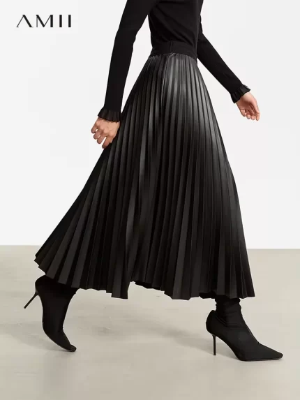 AMII Minimalist Retro Fashion Women Skirts 2024 Winter New A-line Pleated PU Simple Office Lady Leather Skirt Female 12323021