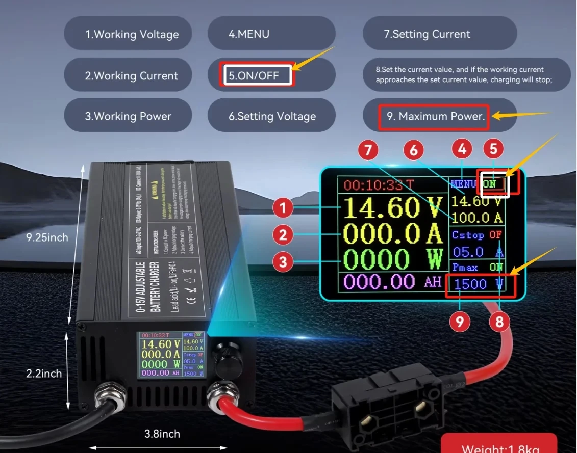 The following is an introduction to the new 2025 large screen charger. When connecting the power supply, please be sure to first press the button to turn on the charger, so that the OFF button in the upper right corner of the screen is changed to ON (icon 5). The actual current and voltage are displayed on the left side of the screen, and the set voltage and current are displayed on the right side. Do not modify the parameters set on the right side (icon 9). Especially do not change the power value. Otherwise, there will be no warranty!