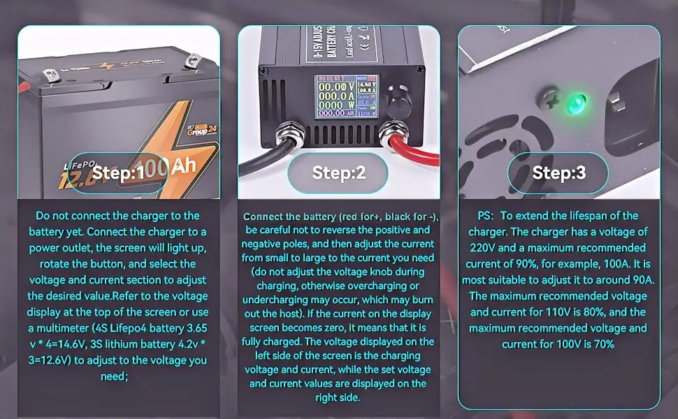 Step3: When using it later (the voltage has been set for the first time, no need to set it later) ——- connect the battery first (very important, it can protect the charger) ——- then connect the power supply- ———Follow this step for later use, no need to adjust the voltage and current (unless you want to modify it)
