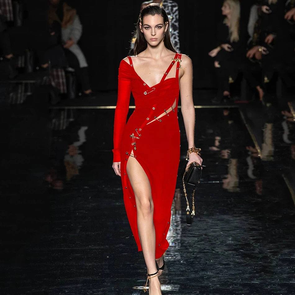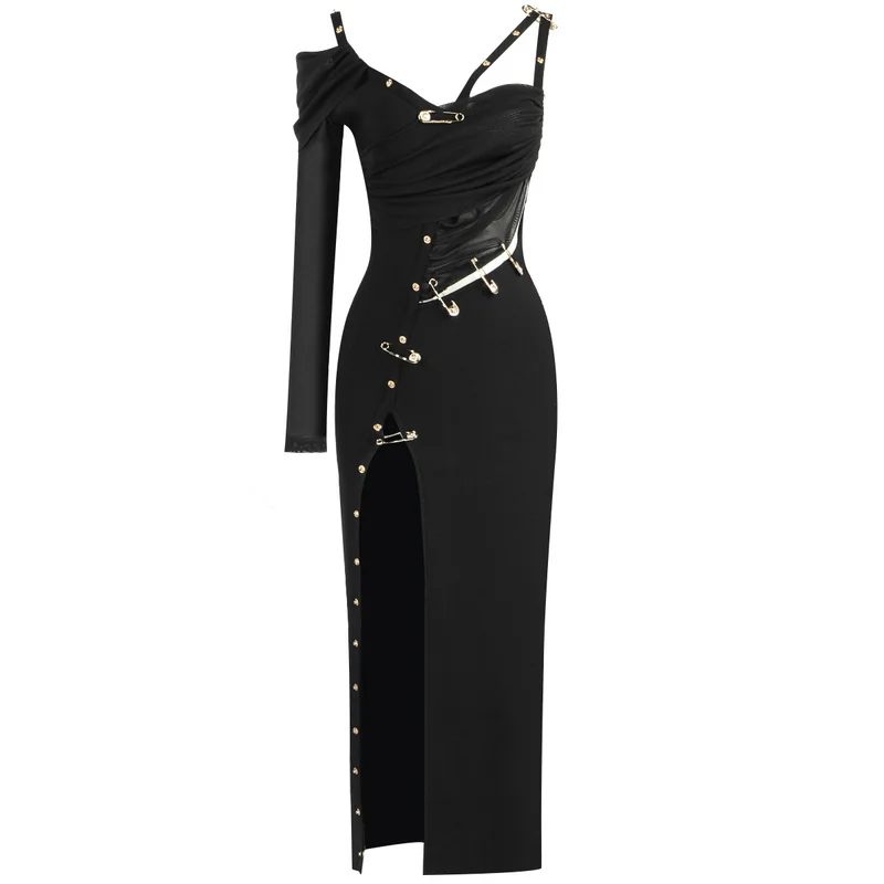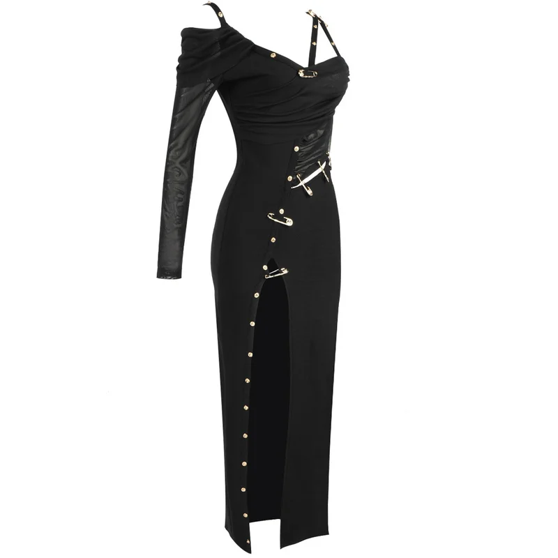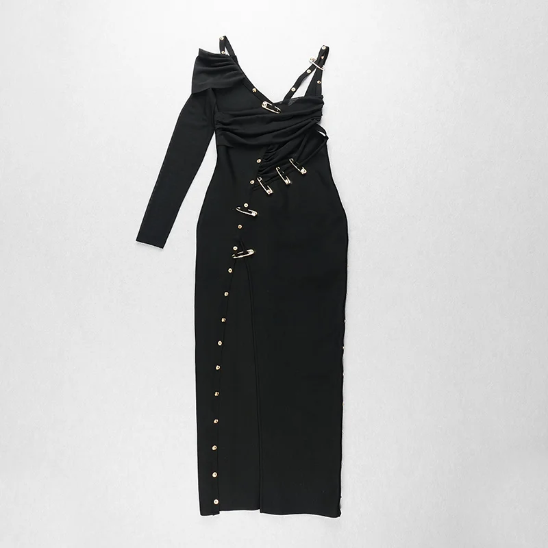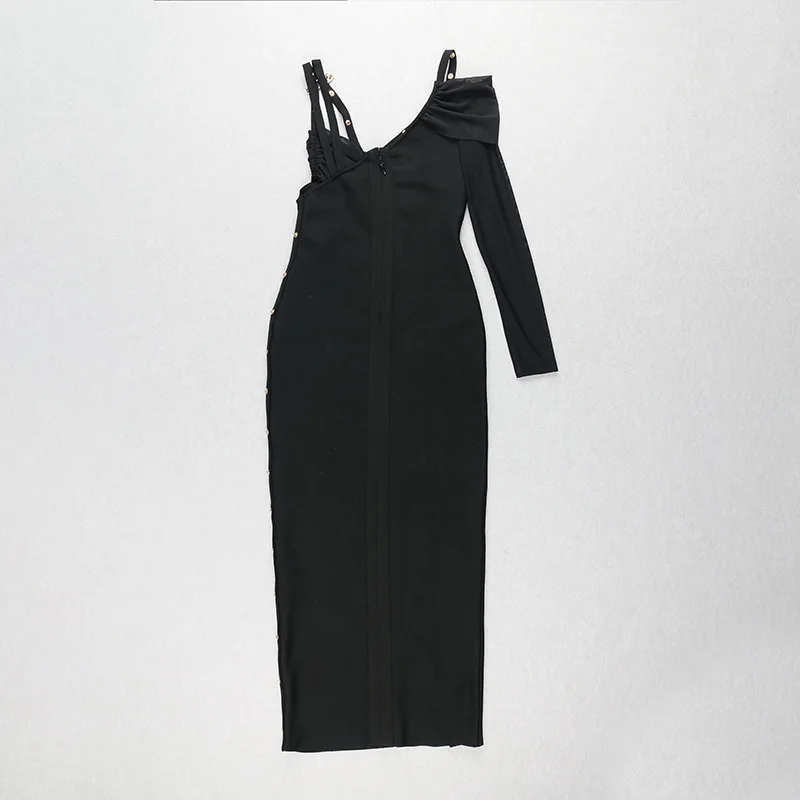 2021 New Women’s High Quality Black Long Sleeve One Shoulder Open Fork Rayon Bandage Dress Party Bodycon Long Dress Vestidos