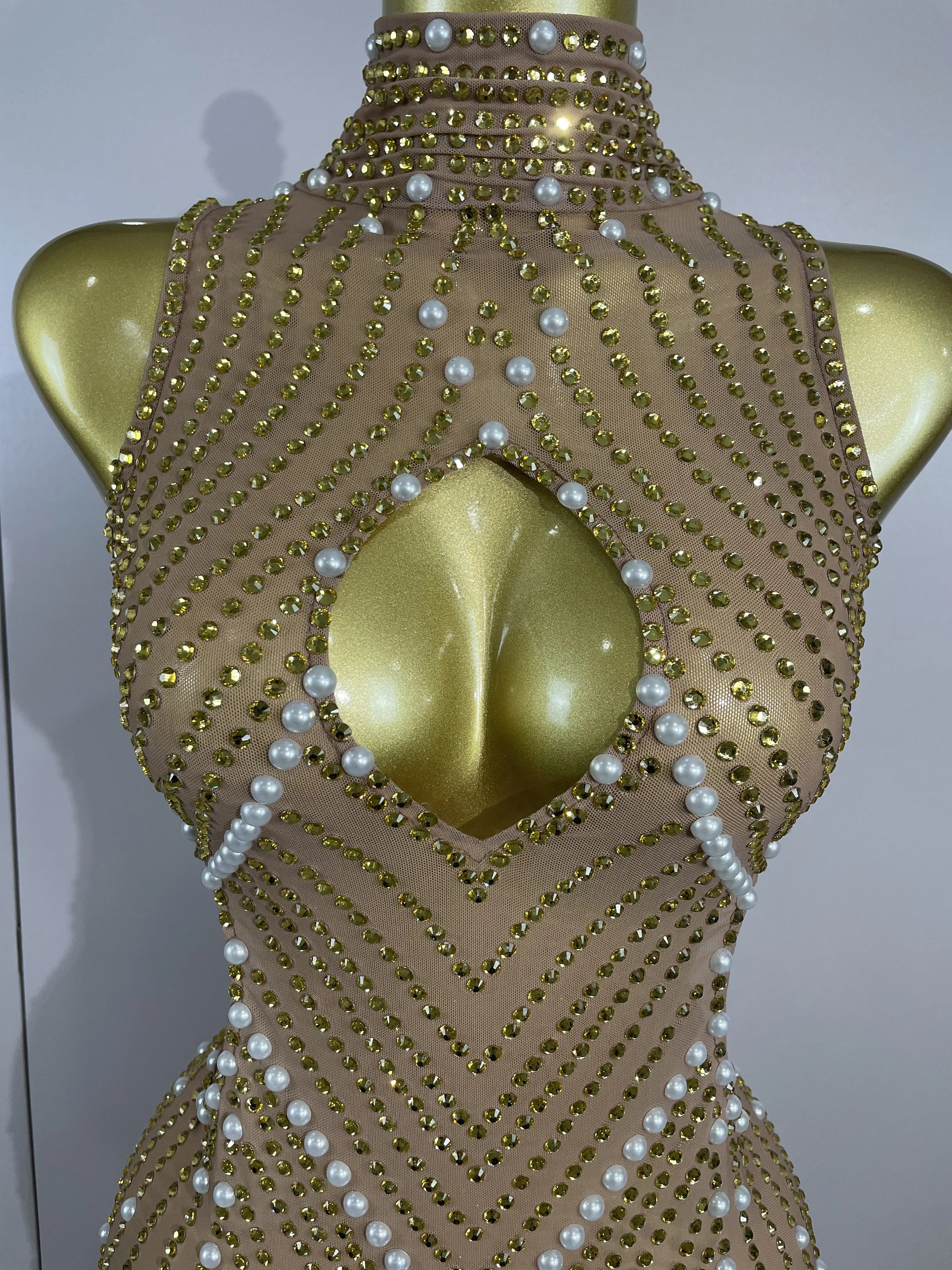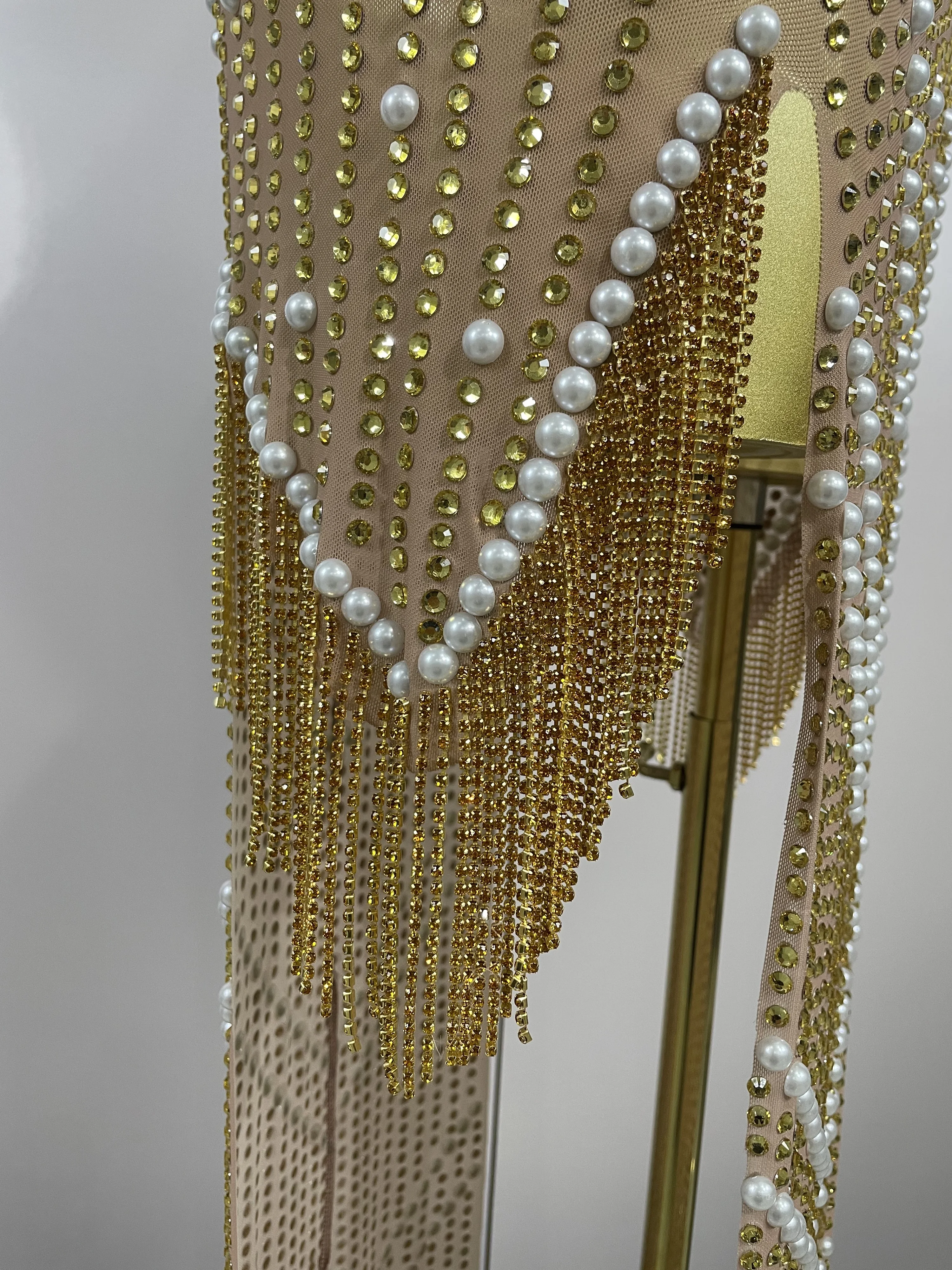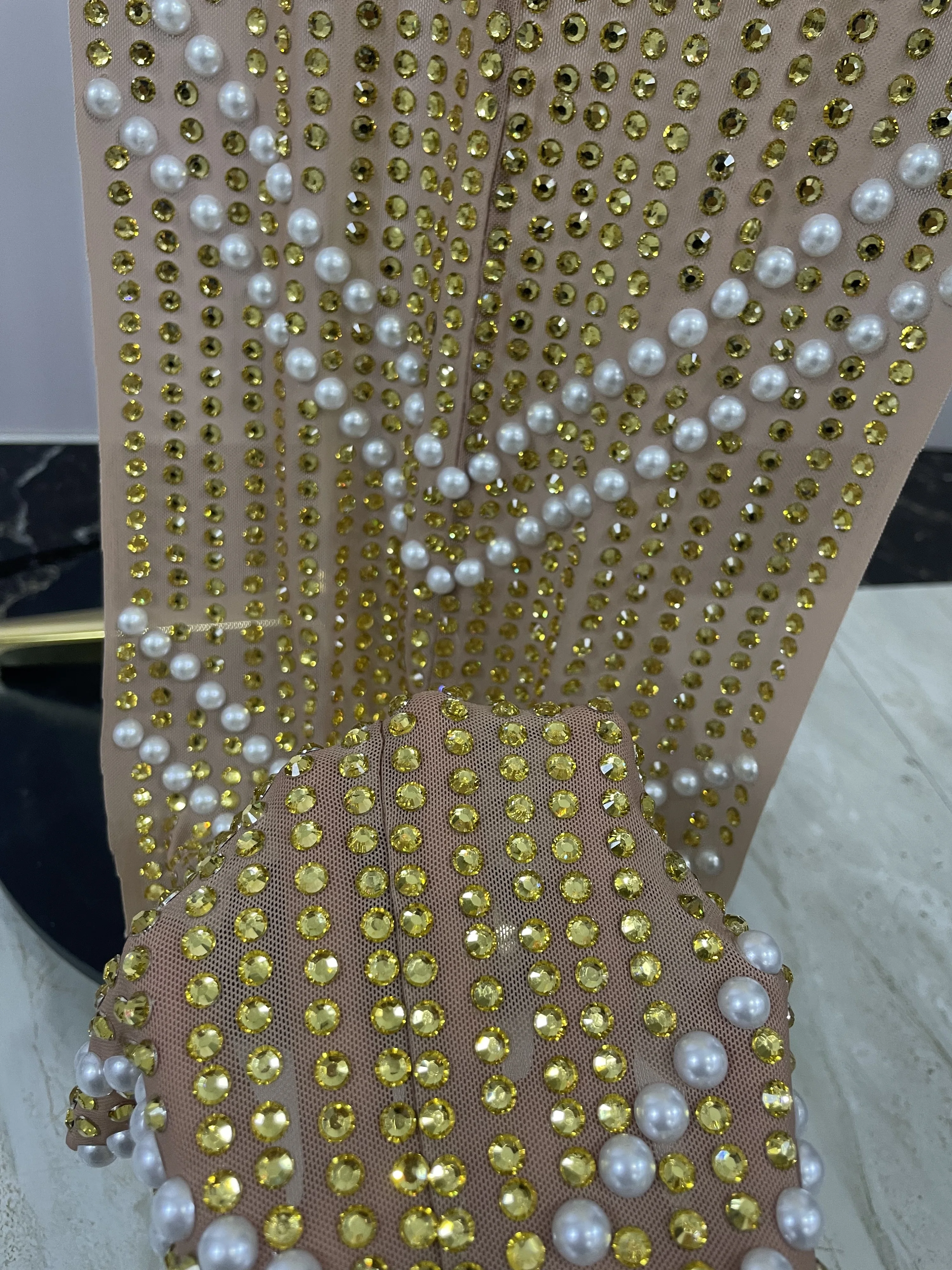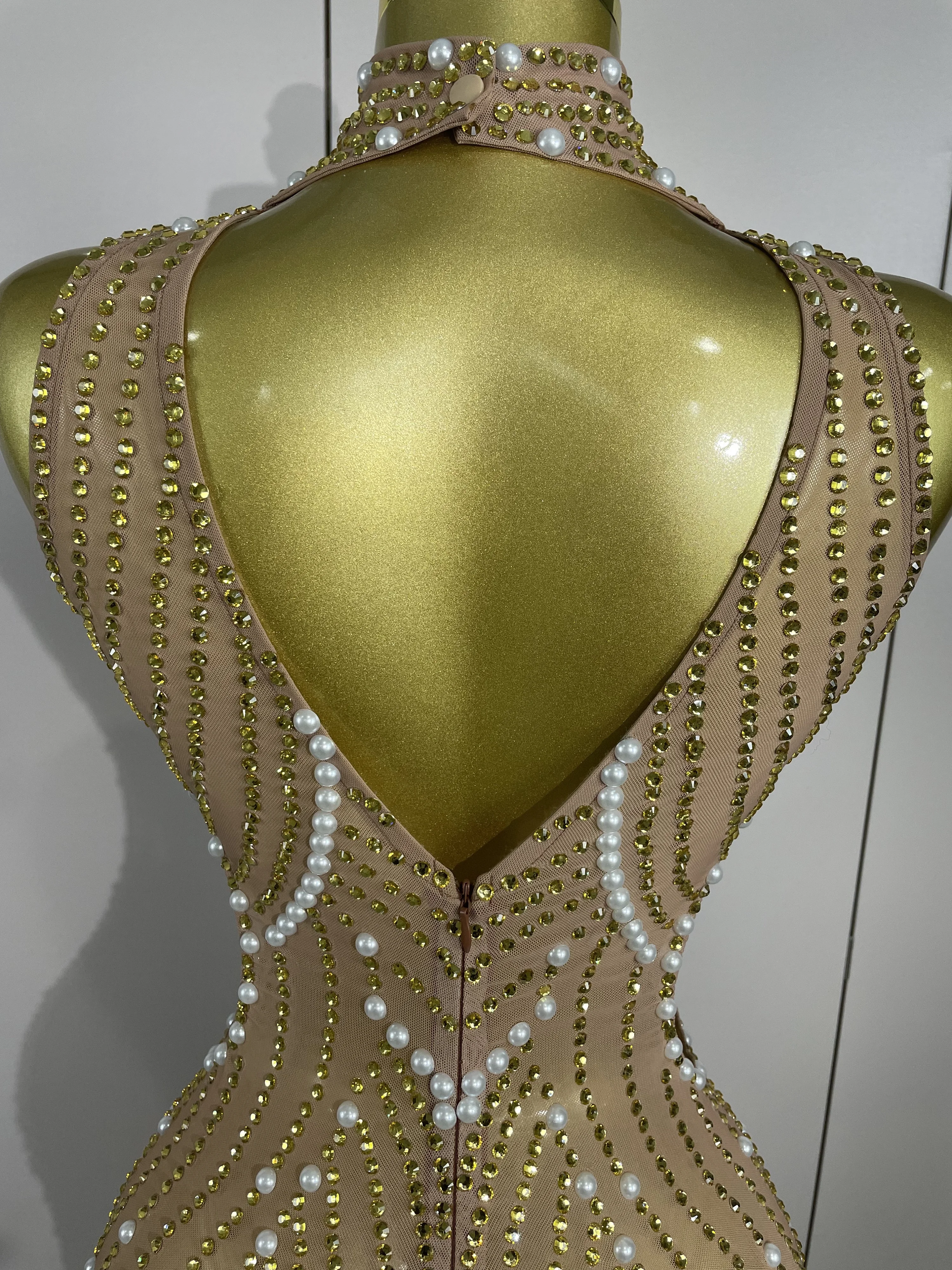 Be the first to review “2025 New Designed Sexy Sparkle Gold Rhinestones Chains Pearls Long Dress Women Evening Birthday Celebrate Performance Costume” Cancel reply