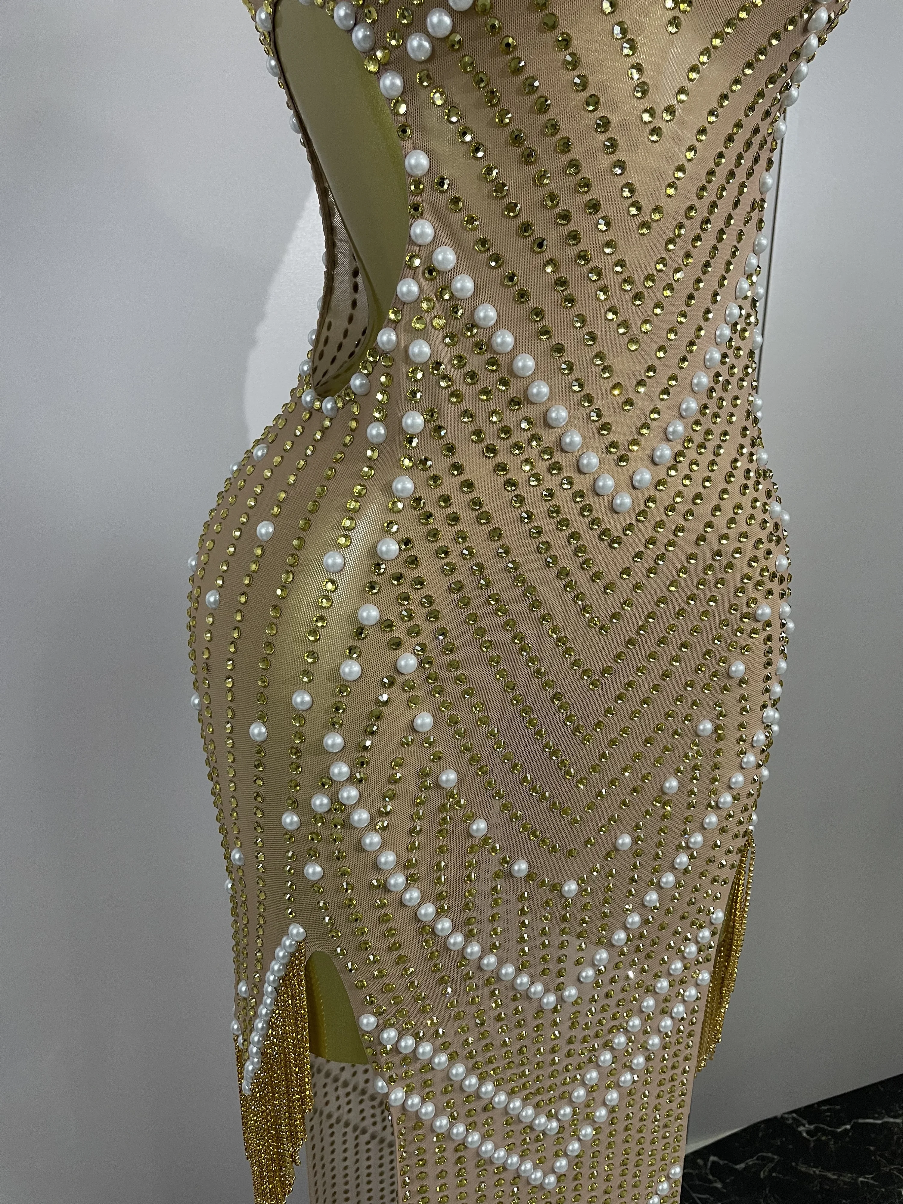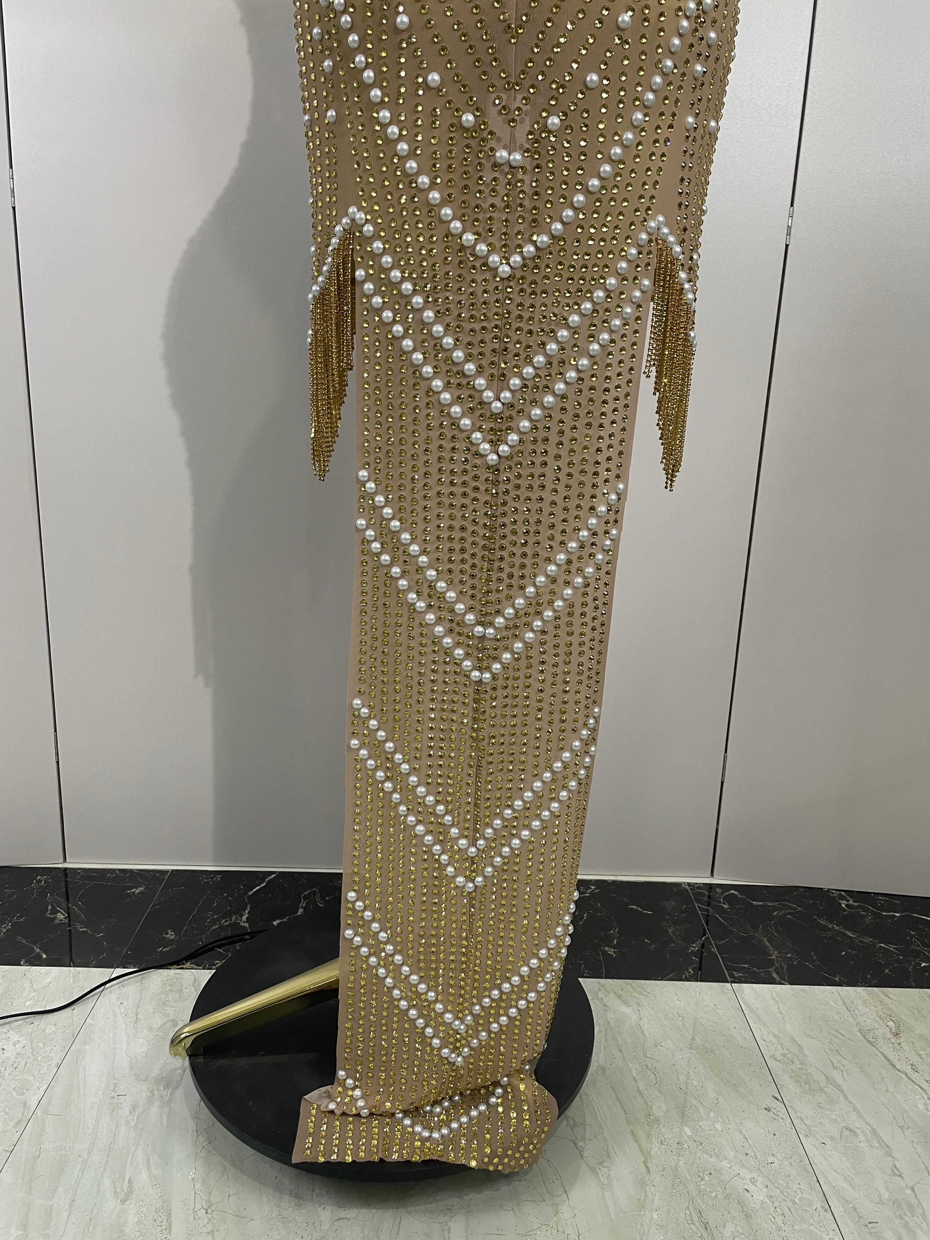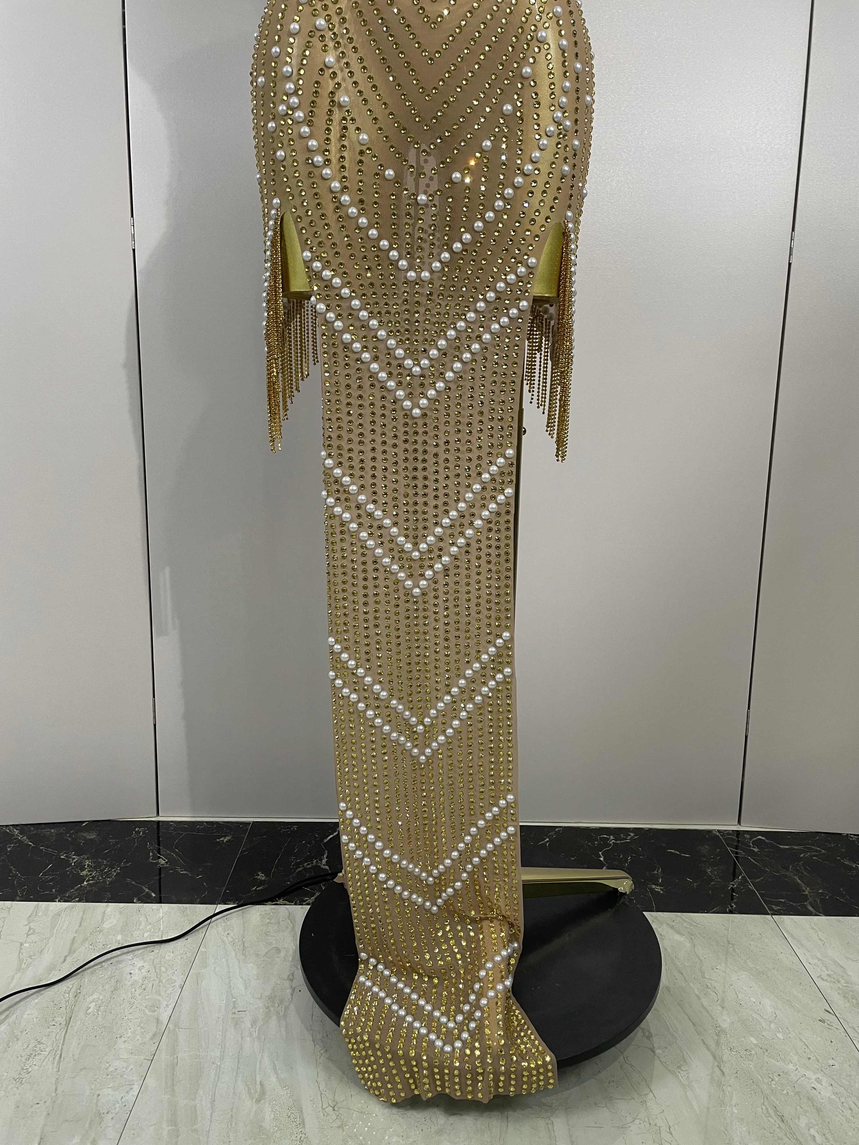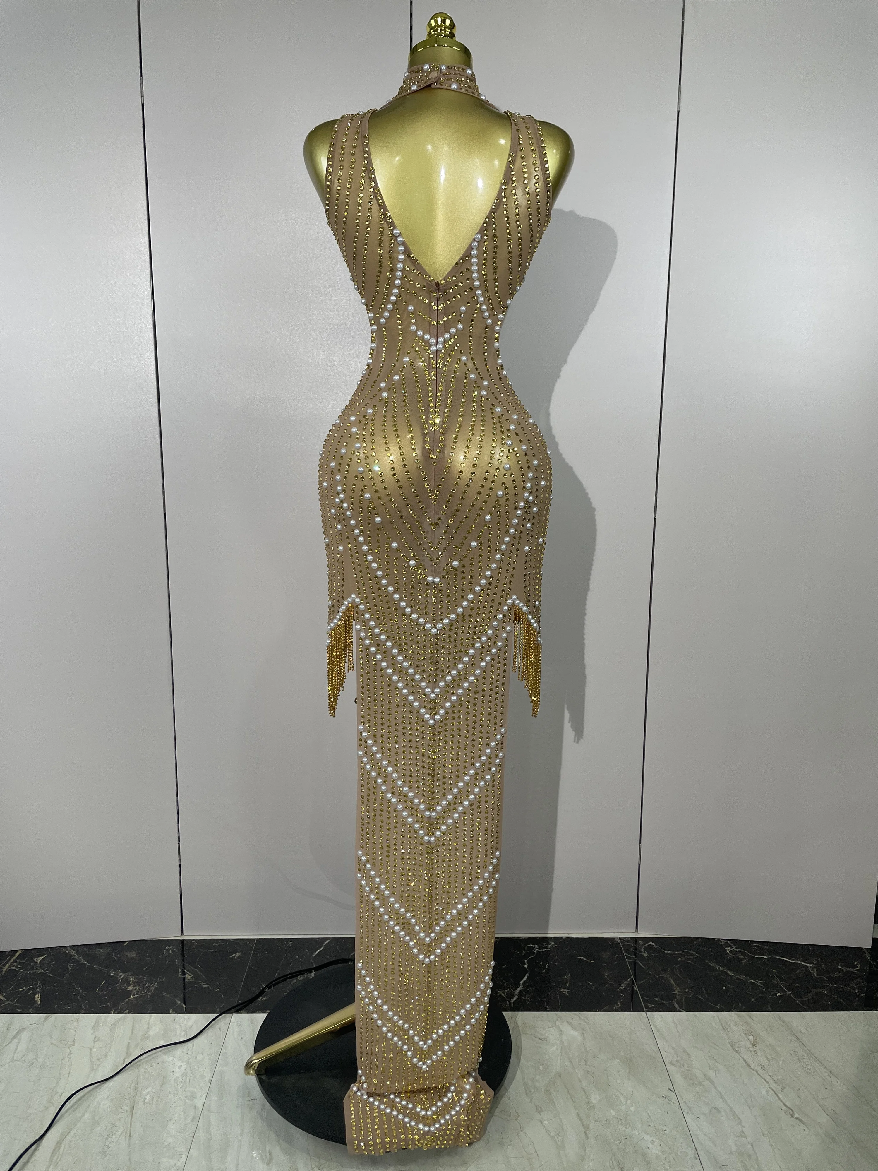 2025 New Designed Sexy Sparkle Gold Rhinestones Chains Pearls Long Dress Women Evening Birthday Celebrate Performance Costume