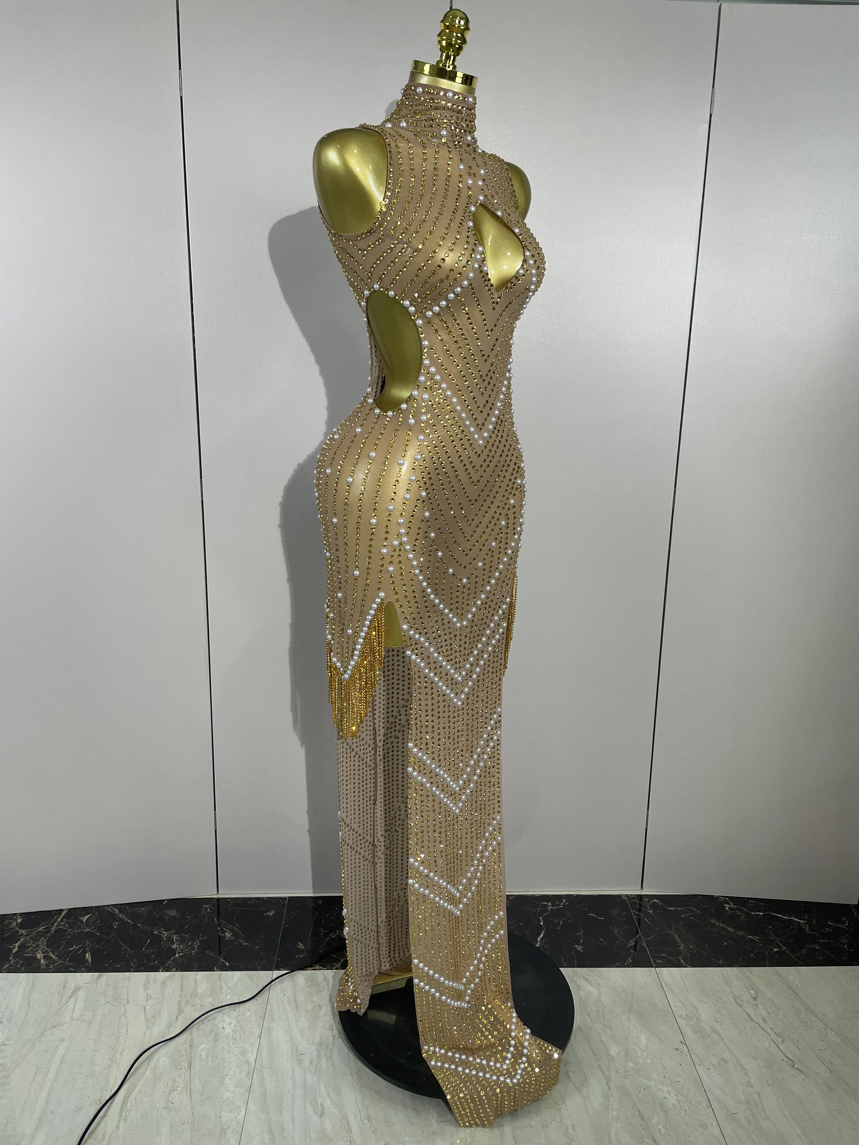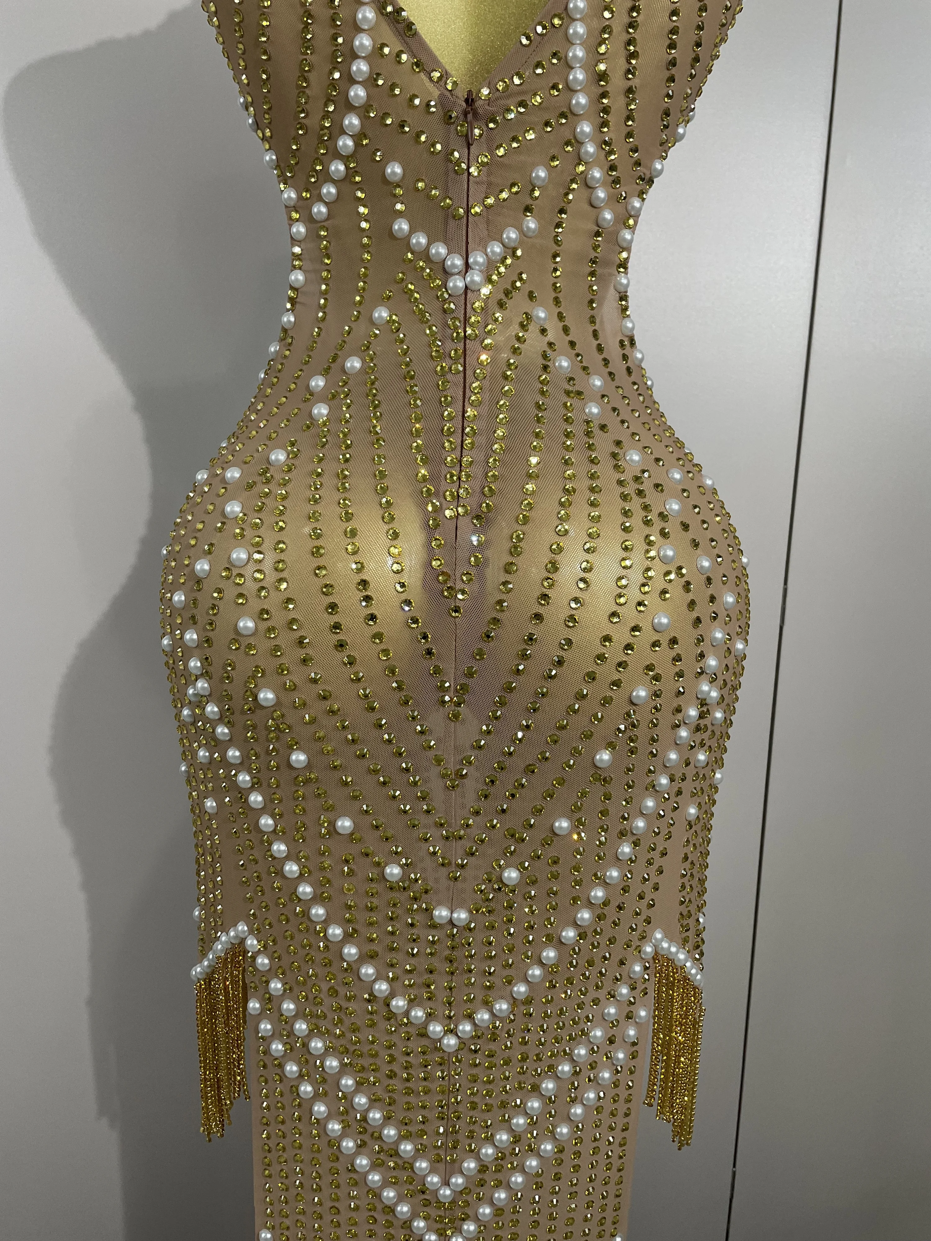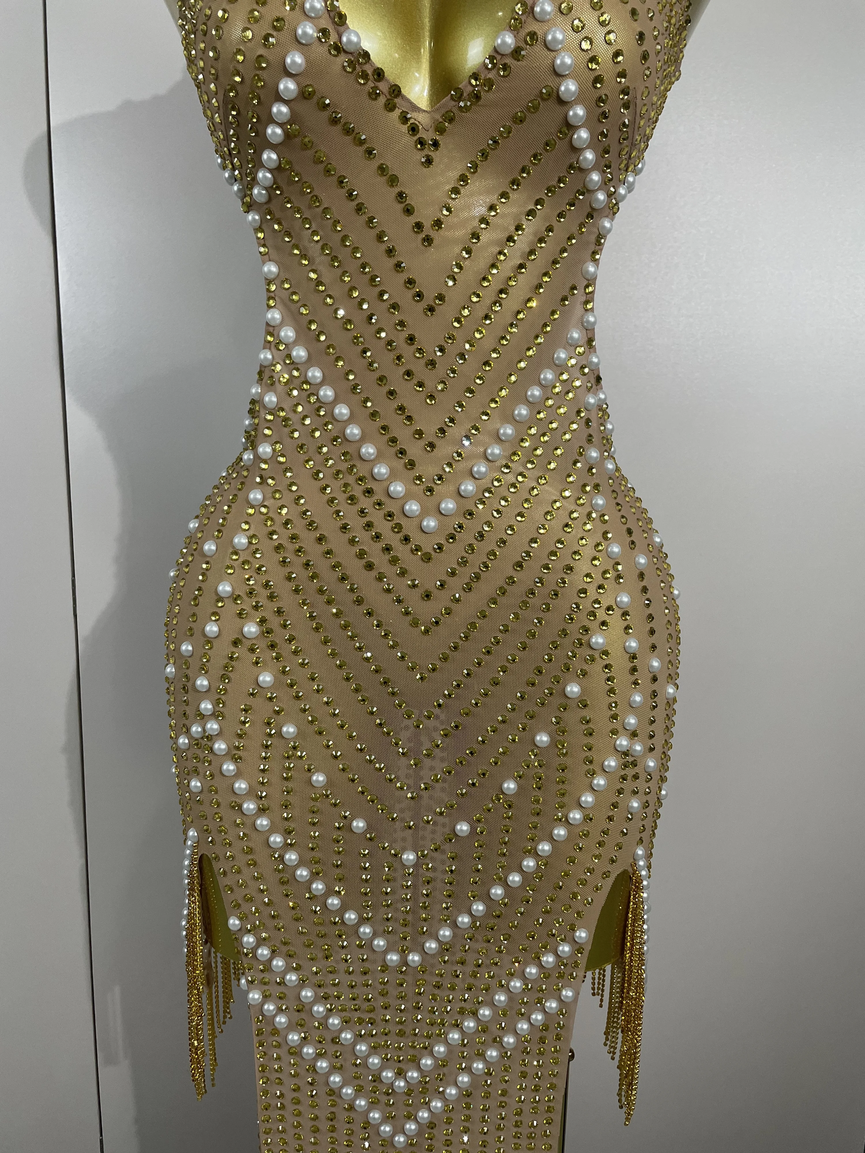 2025 New Designed Sexy Sparkle Gold Rhinestones Chains Pearls Long Dress Women Evening Birthday Celebrate Performance Costume