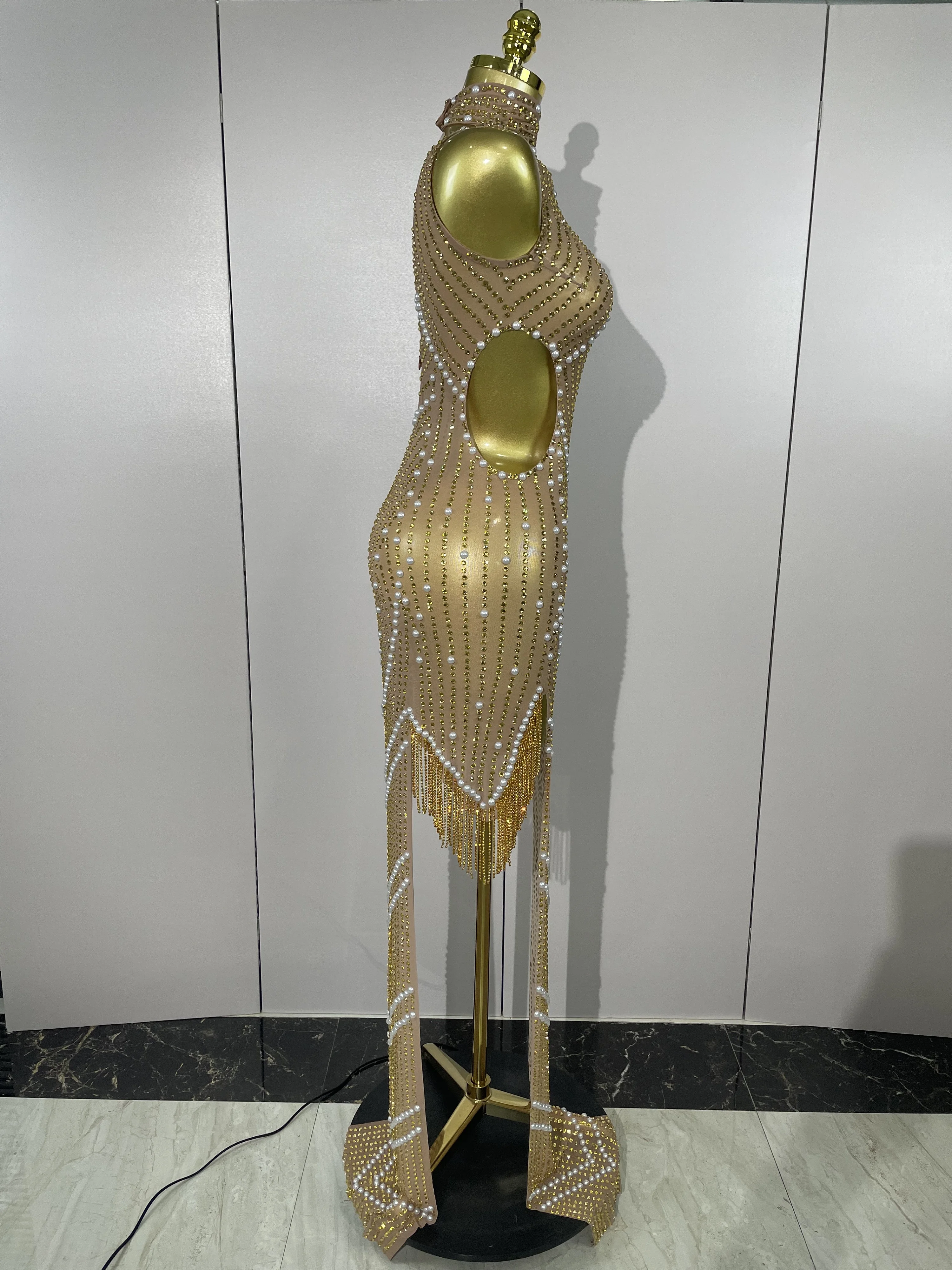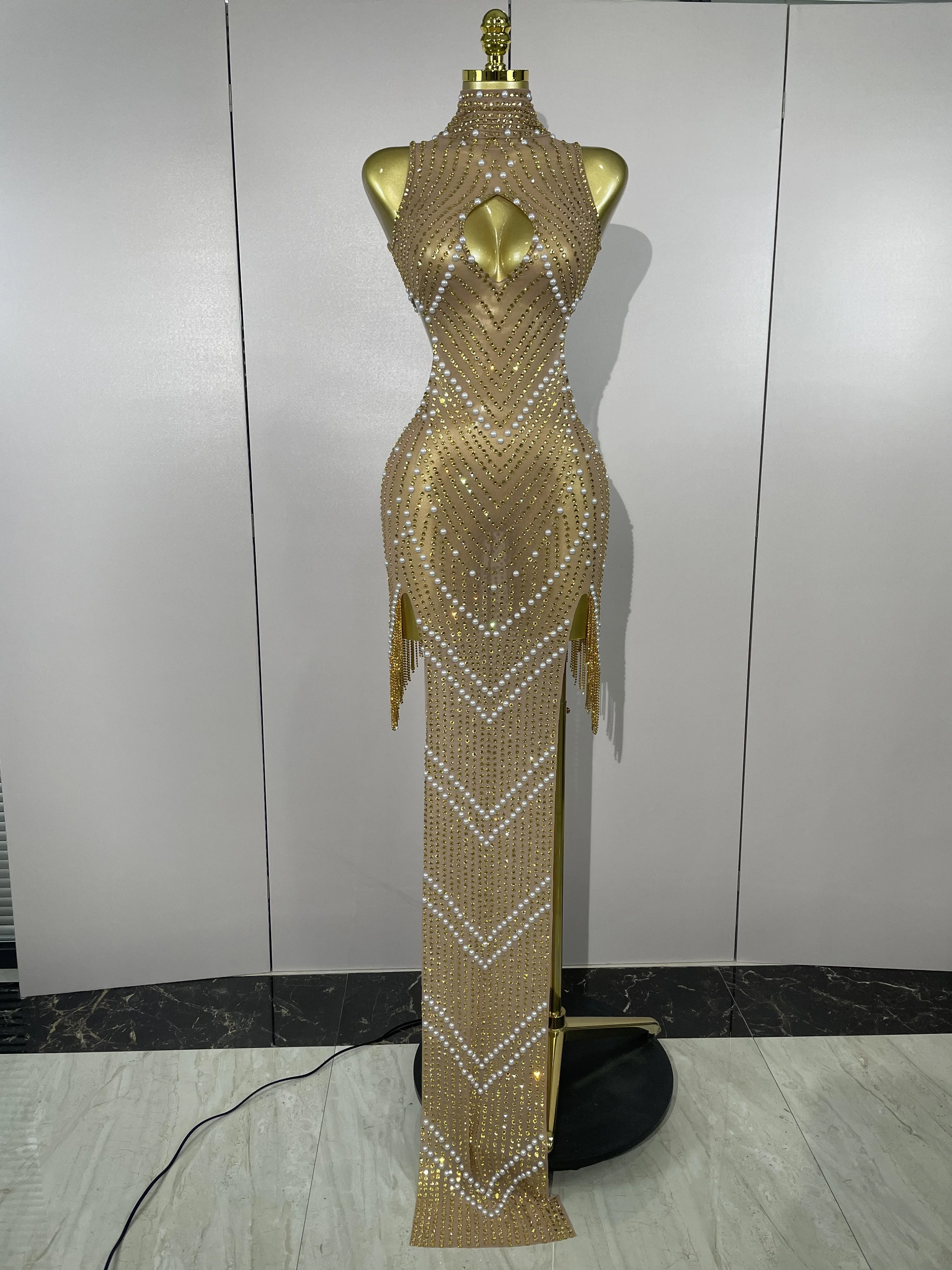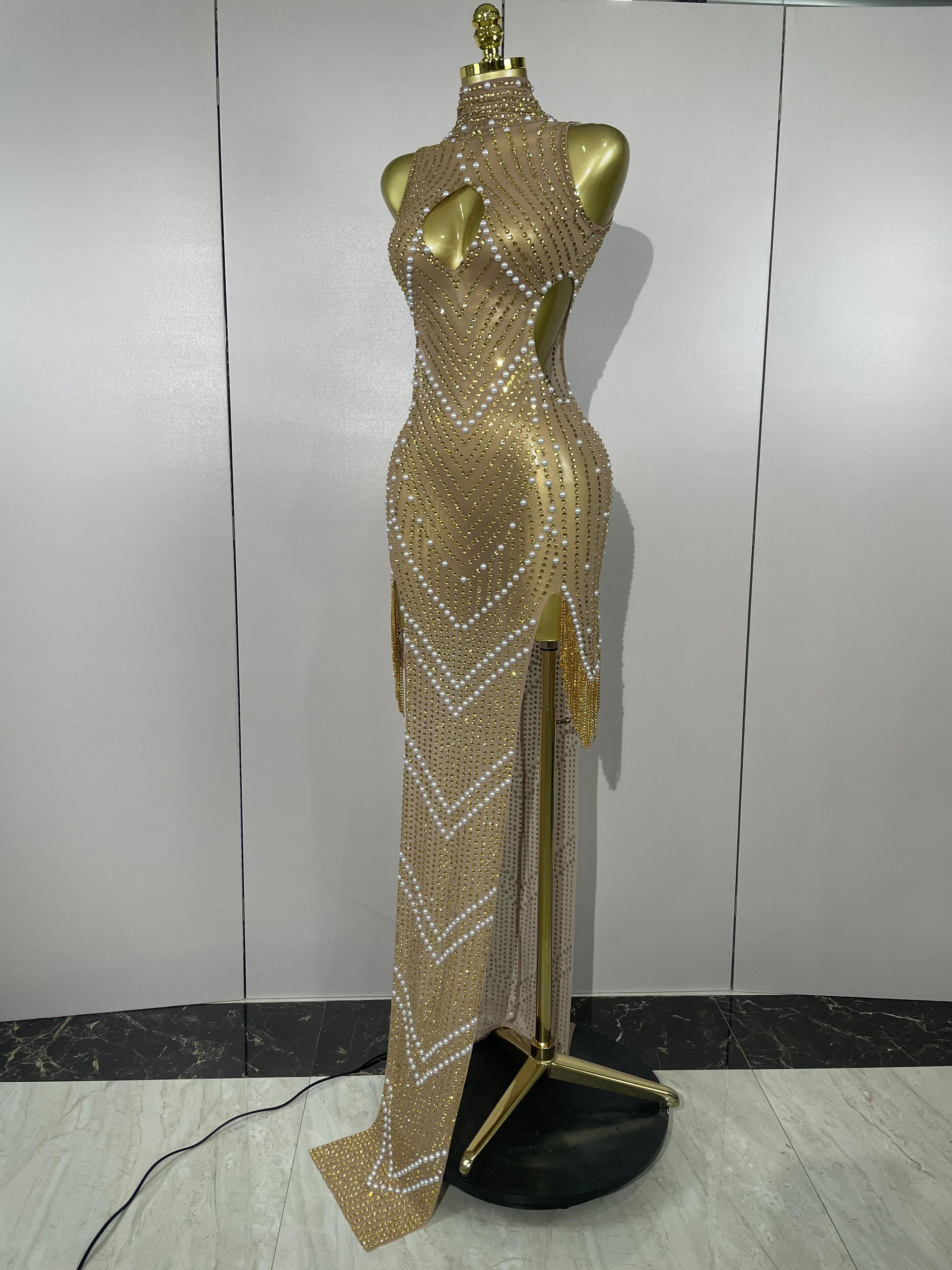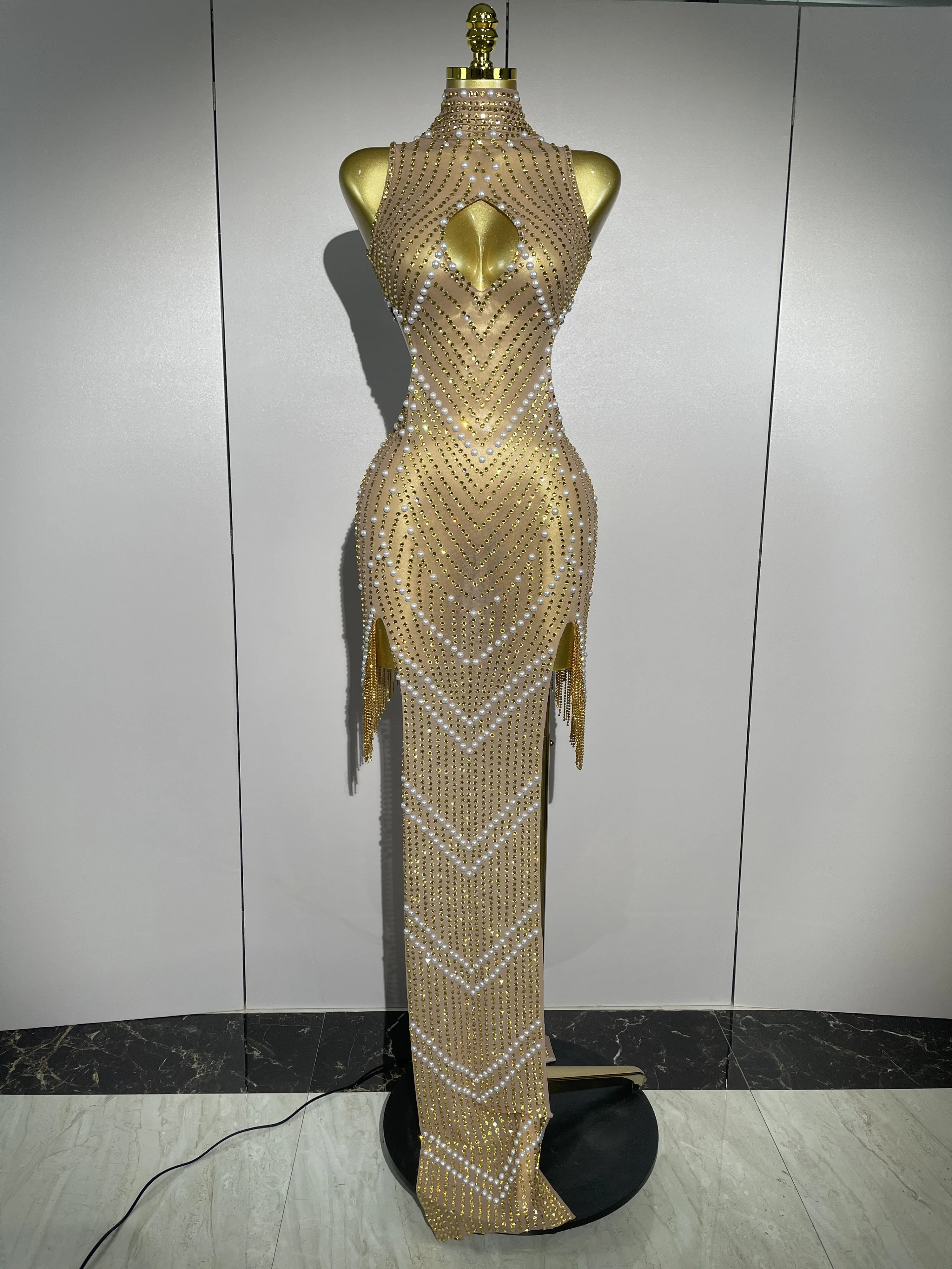 2025 New Designed Sexy Sparkle Gold Rhinestones Chains Pearls Long Dress Women Evening Birthday Celebrate Performance Costume