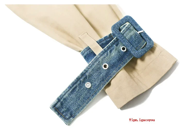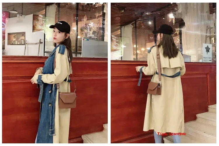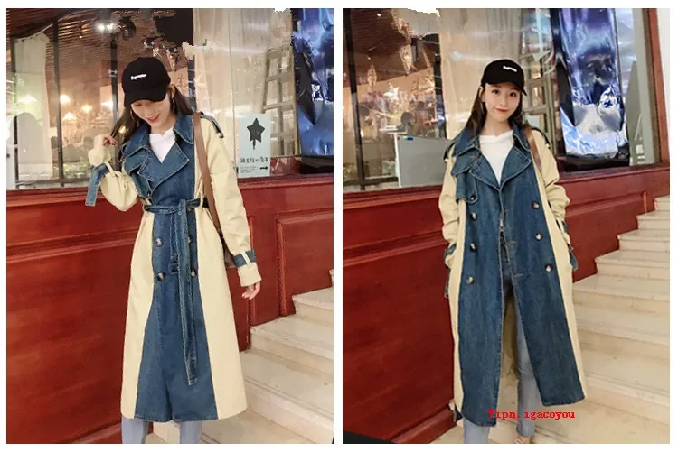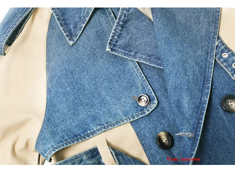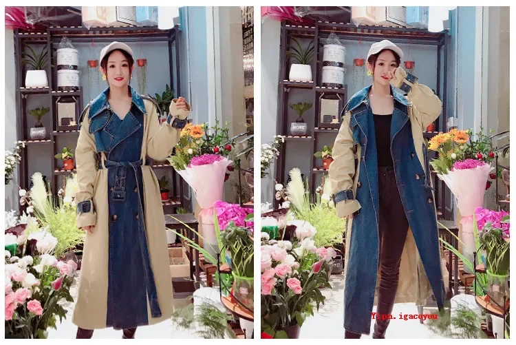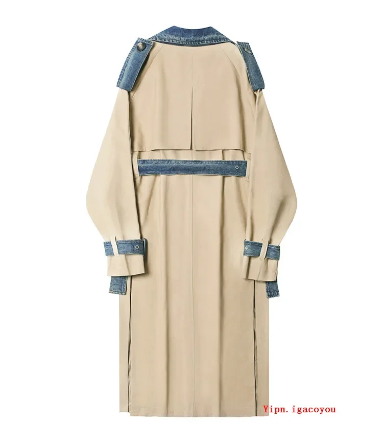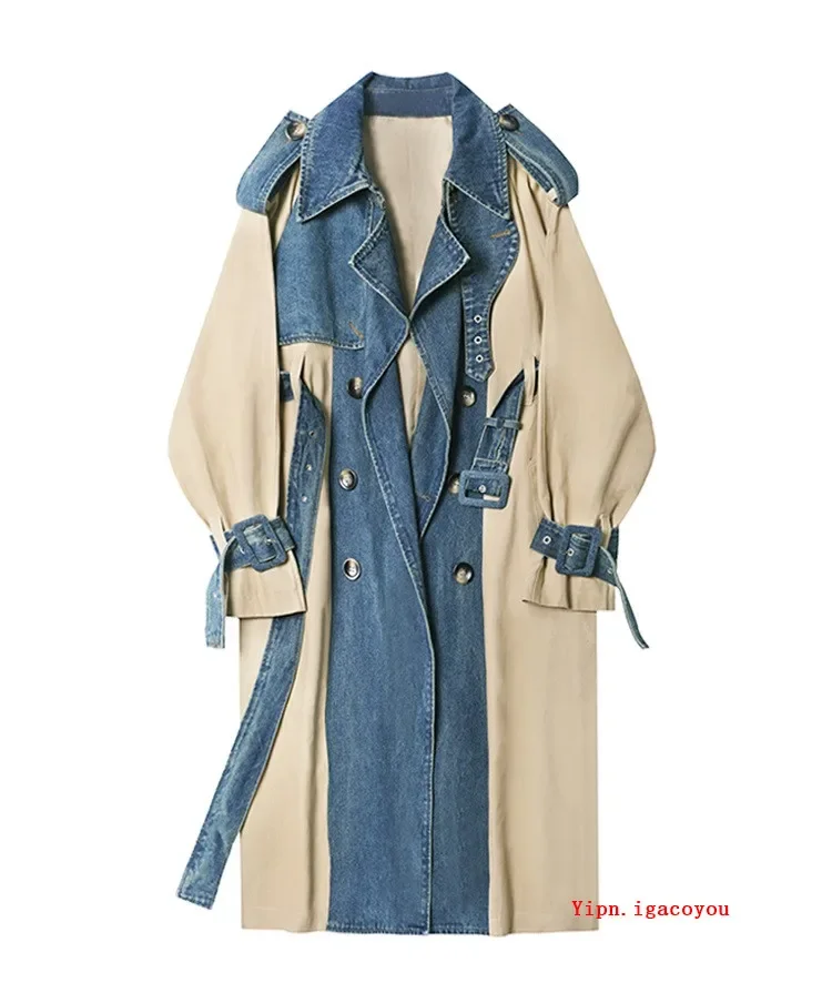 2025 Spring Autumn Fashion Long Denim Splice Trench Coat Women Double Breasted High Quality Windbreaker Female Loose Outerwear