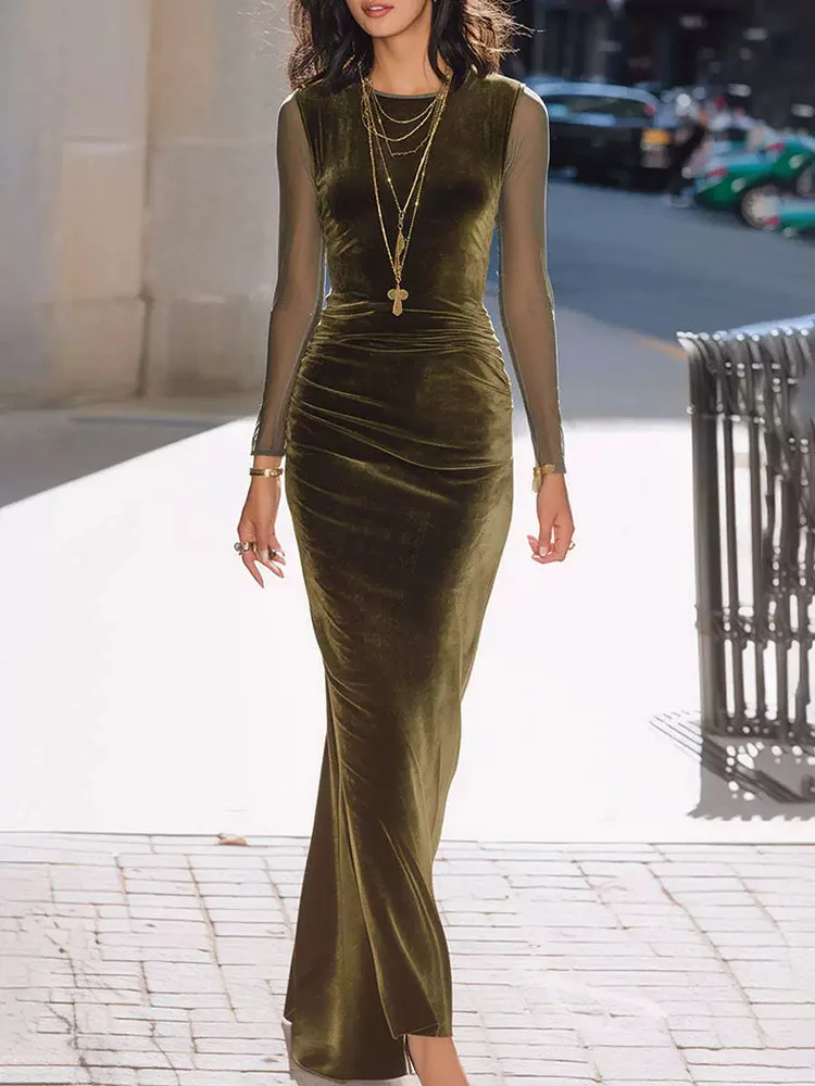 2026 Fashion Slimming Velvet Warp Hip Dress Casual Mesh Long Sleeve Solid Long Dress Elegant Draped Hight Waist Party Dresses