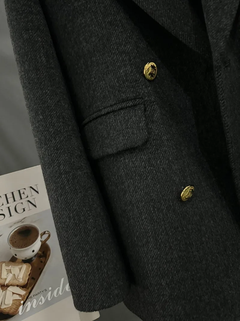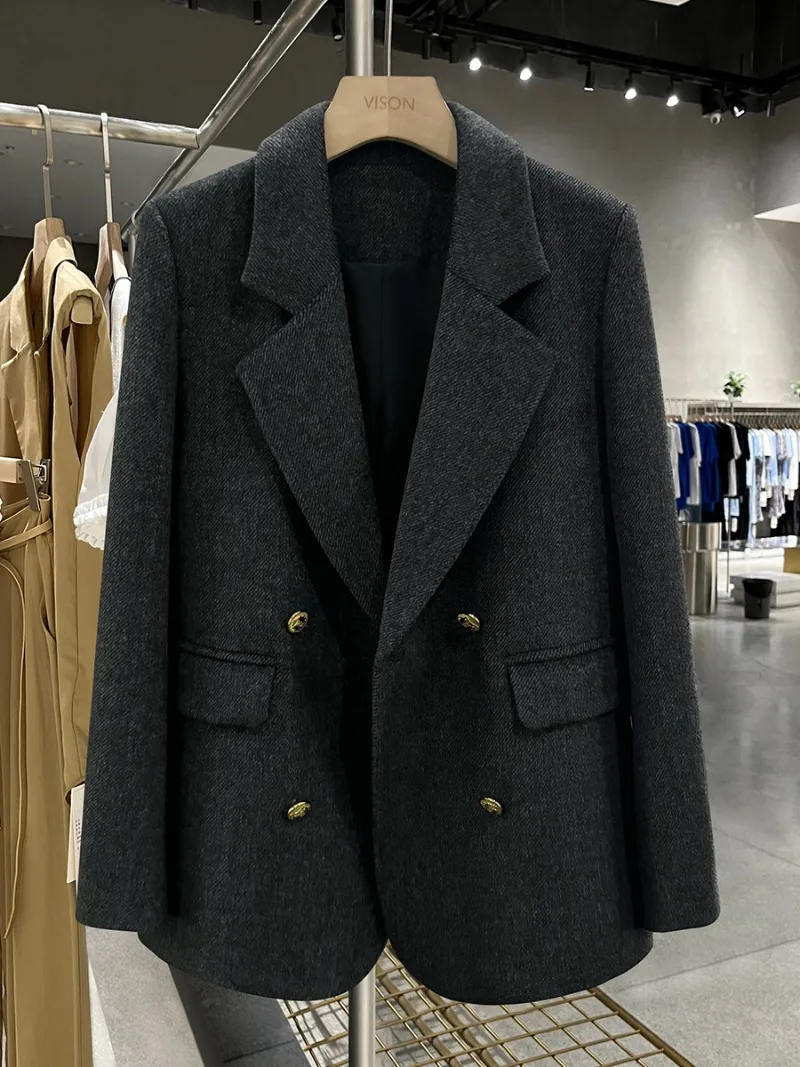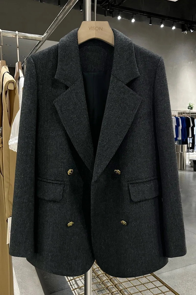 2026 Korean Dark Grey Wool Suit Jacket Women Woolen Blazers Autumn Winter Vintage Double-breasted Casual Tops Lady Office Coats
