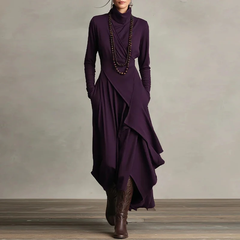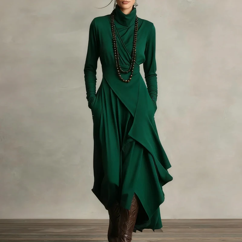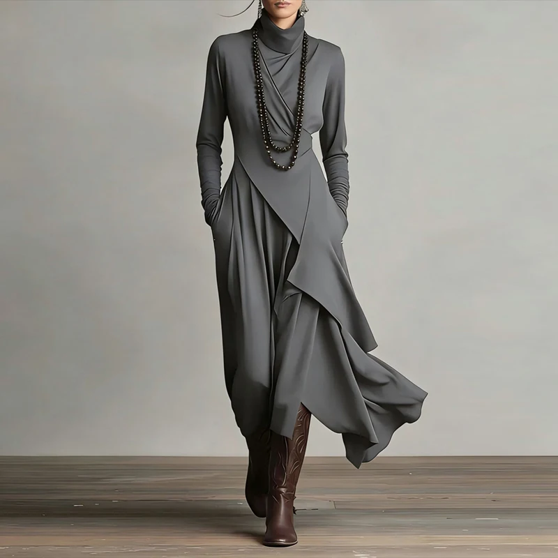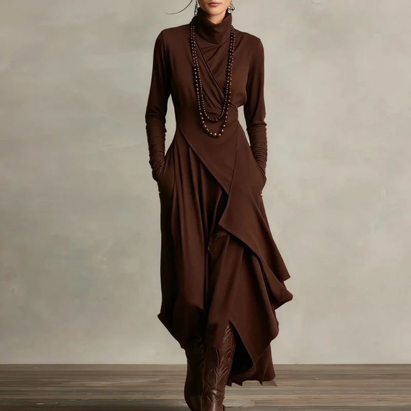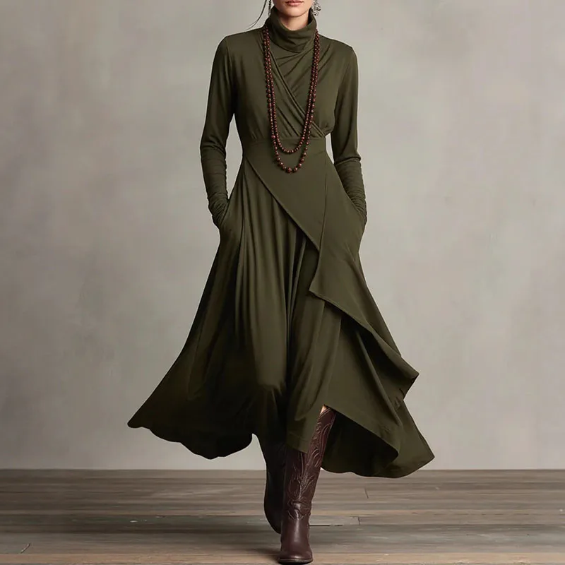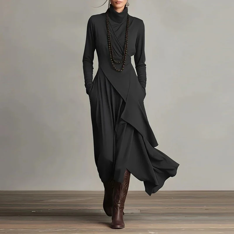 2026 Spring Elegant Turtleneck Irregular Long Dress Woman Solid High Waist Pocket Party Dress Autumn Long Sleeve Slim Maxi Dress