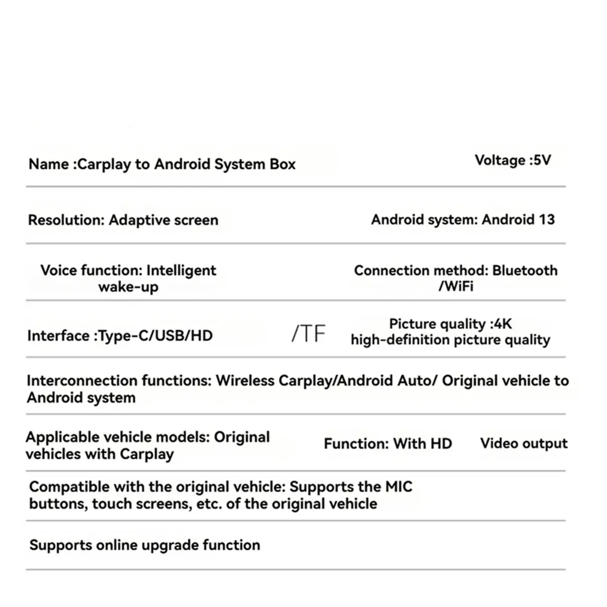 - Specification 3:Â Carplay to Android AI Box
