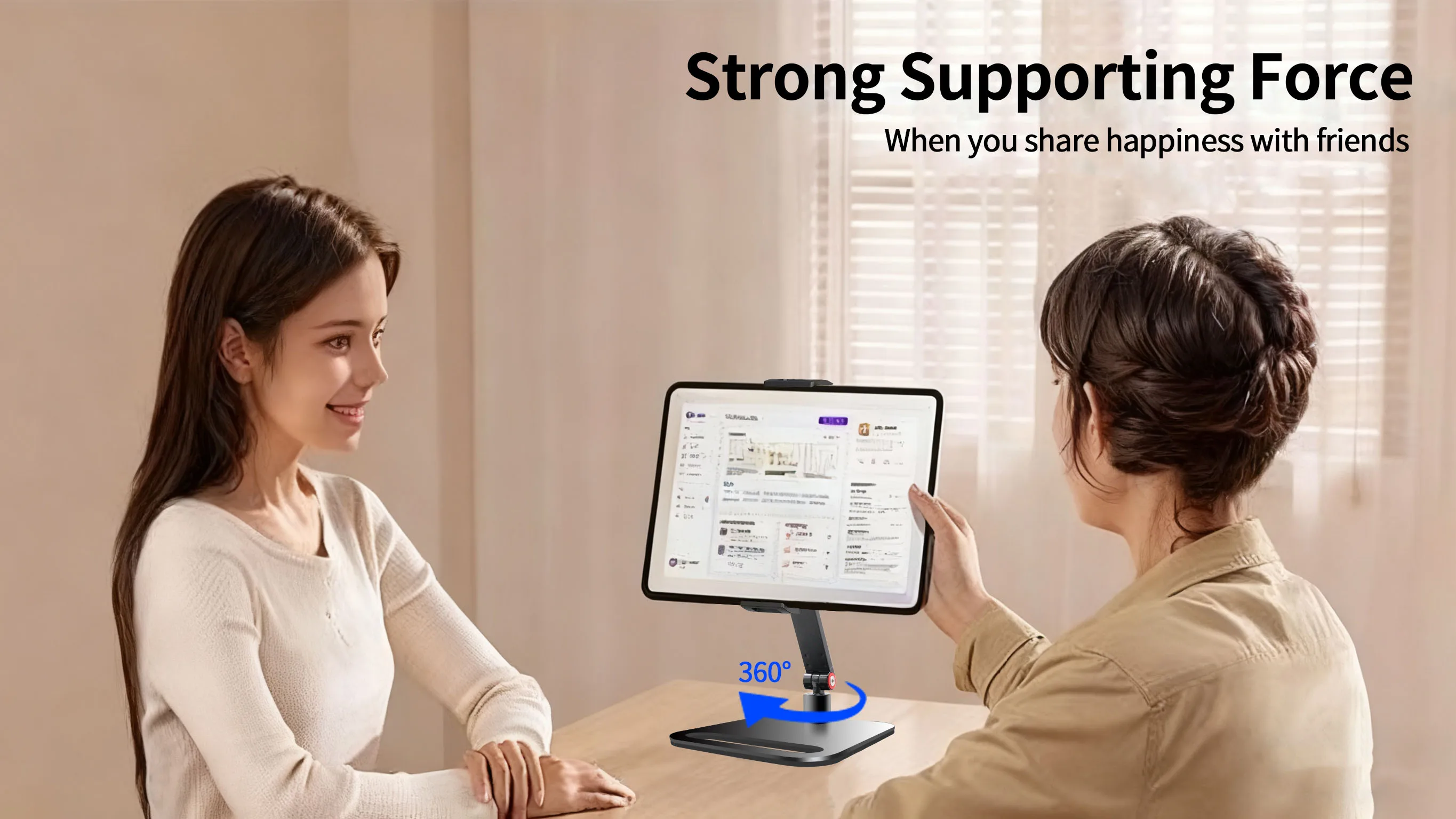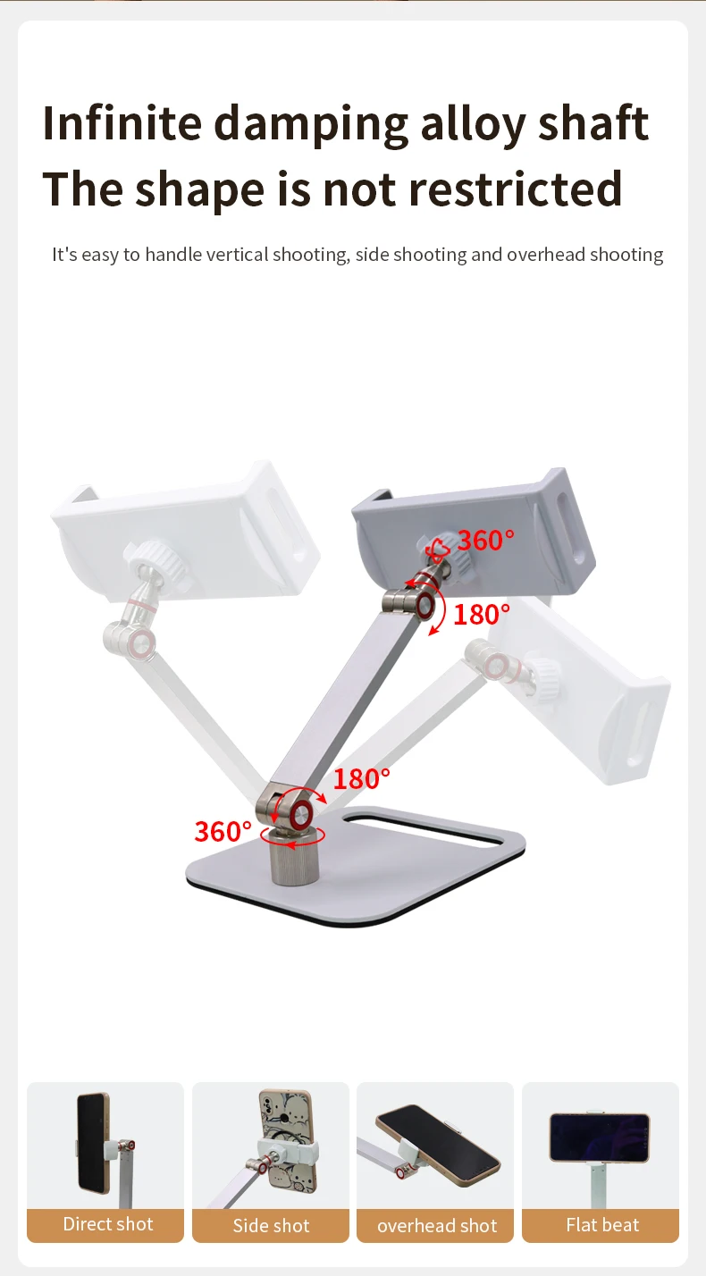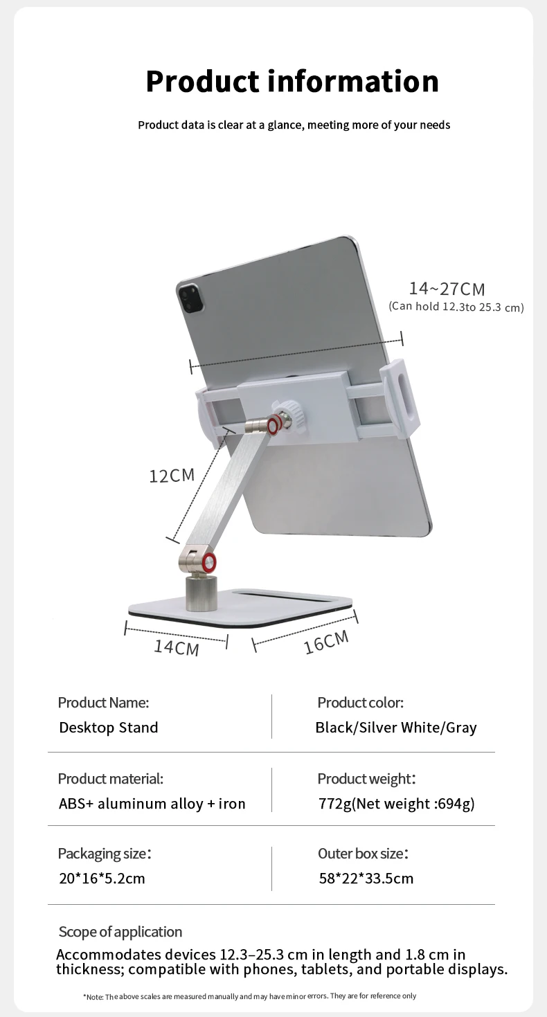 2025 New Simple Foldable Adjustable Rotating Phone & Tablet Stand Mobile & Desktop Video Hand Holders for Table Use Wide compatibility Our mount is compatible with all 4-13 inch electronic devices, including mainstream mobile devices such as smartphones and tablets. The clamp can be extended from 14-25cm to accommodate devices of various sizes. (With a sturdy metal structure and reasonable center of gravity design, even heavier devices with cases can be placed stably without the need for additional weight to ensure stability during use.) Free Your Hands Whether you’re working at a desk, relaxing at home, or engaging in video interactions, our adjustable desktop stand frees your hands, helping you find the perfect viewing angle to enjoy movies, live streams, TikTok, vlogs, or support your device while studying or working to access information, eliminating hand fatigue with every use. Easy to install & excellent customer service No tools required—the stand features a foldable design, ready to use upon unfolding. When folded, it has a compact size (package dimensions: 20x16x6 cm), making it easy to carry and space-saving. For any defects, including structural loosening, damaged or missing parts, or even if you simply don’t like it, please contact the seller directly: Dongguan Boxiang Electronic Technology Co., Ltd. We offer a 13-month warranty, 100% refund or replacement for quality issues, and dedicated 1-on-1 customer service to resolve issues quickly and effectively. We also provide and customization services. Durable high-quality materials Combining high-quality metal with ABS material ensures a longer service life, excellent durability, and a stable structure that does not wobble. (The metal stand, paired with a scientifically designed structure, offers superior load-bearing performance, ensuring safe placement of devices and meeting practical and durable usage requirements.) Flexible desktop stand The stand supports 360-degree rotation and 150-degree angle adjustment, allowing you to easily change any viewing angle; the multi-directional rotation design provides the stand with higher flexibility, meeting the needs of different usage scenarios. Whether it’s vertical placement, horizontal placement, or dual-screen interaction, it can be easily adapted, bringing you a more personalized usage experience.